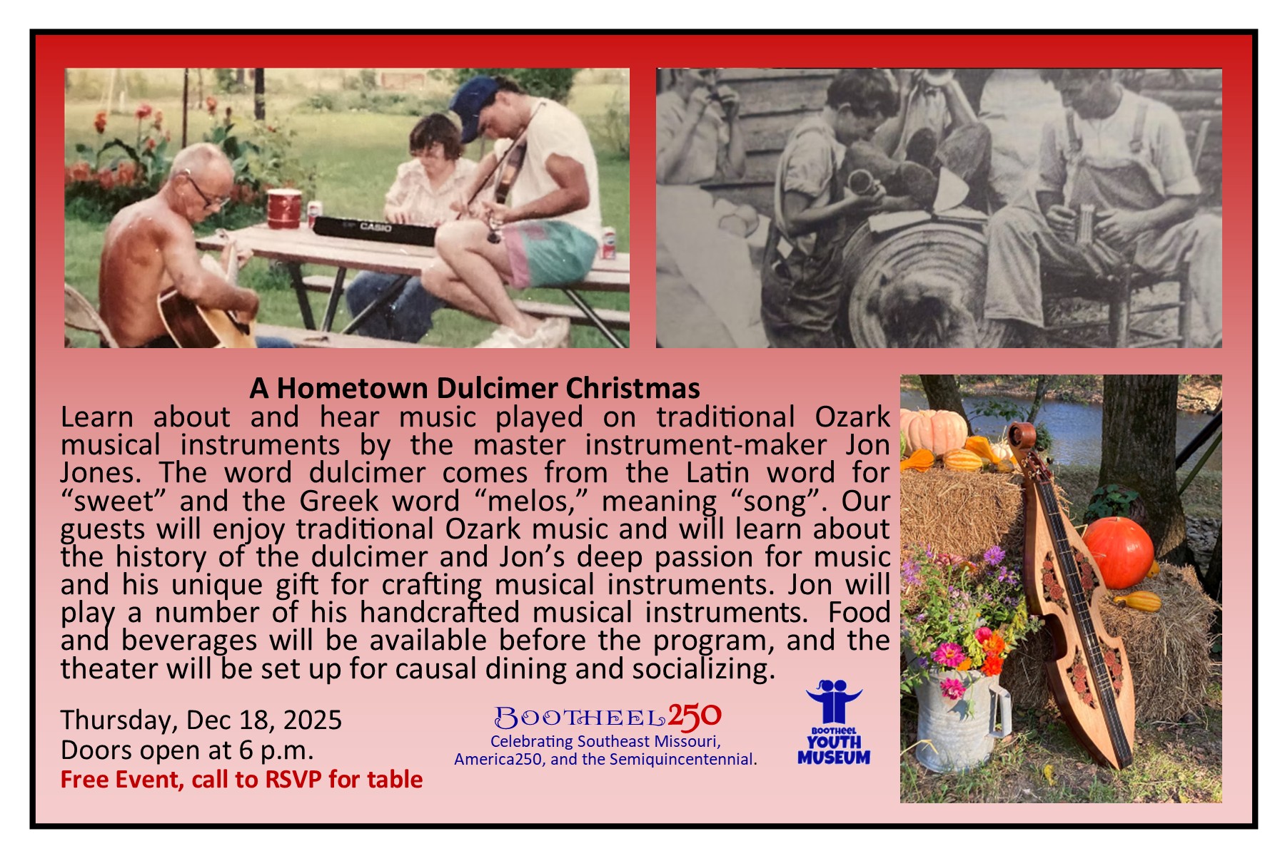 Presenter Jon Jones has a deep passion for music that spans back through his family for generations. As a direct descendant of the Russell family that first settled in the Ironton area, Jon is deeply rooted in his community, and his children are the 6th generation on the family farm in Ironton. Jon shares his homemade musical instruments with the community and at local festivals. Join us as Jon presents an evening of Christmas music and shares with us some of the instruments he has made. This program is sponsored by Mitch and Anita Green.